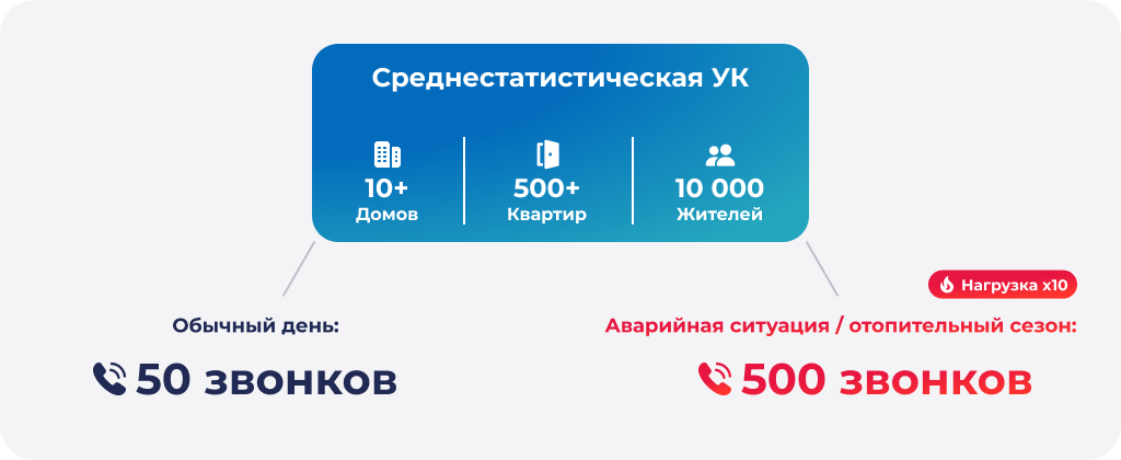 Современная крупная УК — это десятки домов, тысячи квартир и десятки тысяч жителей. В обычный день звонков много, но в пиковые периоды — начало отопительного сезона, аварийное отключение воды — количество входящих взлетает в 5–10 раз.
