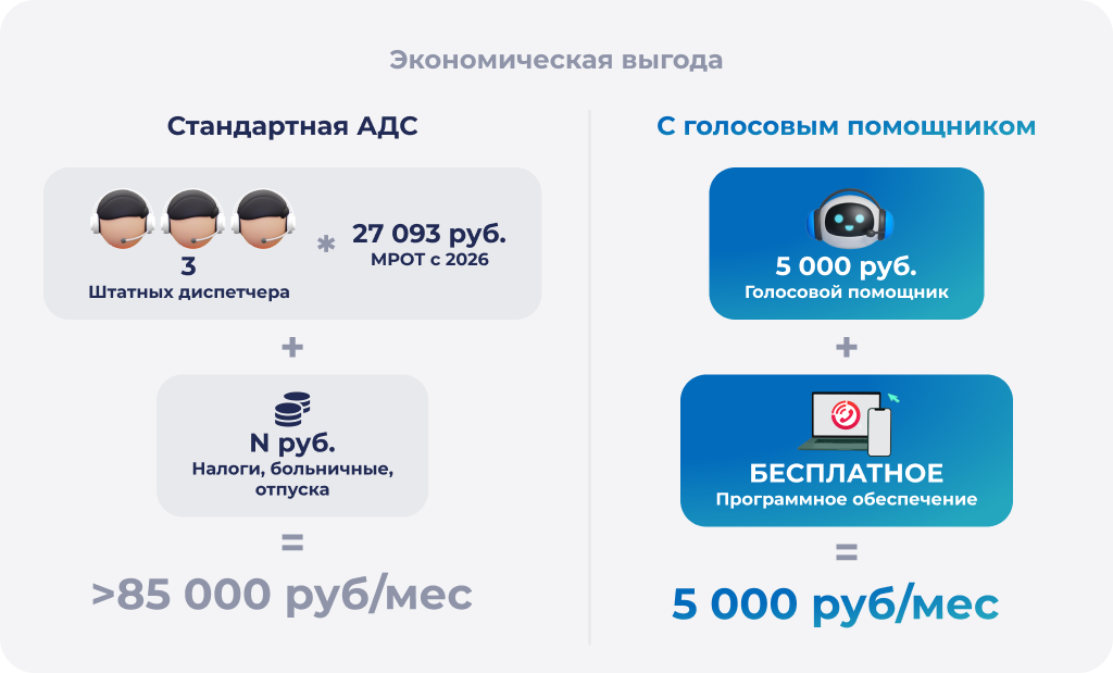 Давайте про деньги. Часто кажется, что экономить − значит не покупать никакие программы и делать всё по старинке. Но давайте посмотрим, что будет, если УК откажется от голосового помощника и оставит только живых диспетчеров: